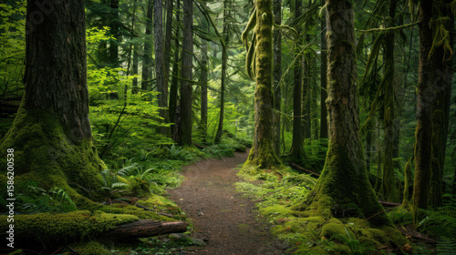 © Delara, Naklejka premium Enchanted forest path bathed in soft green light