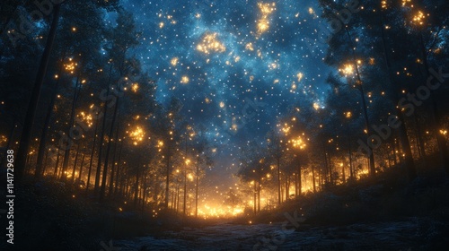 © Ali, Naklejka premium Enchanted forest path, glowing lights, starry night.