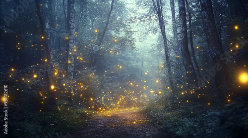 © Sadia, Naklejka premium Enchanted forest path illuminated by fireflies during twilight