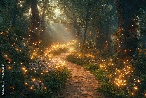 © stockphoto02, Naklejka premium Enchanted forest path illuminated by glowing fireflies and flowers.