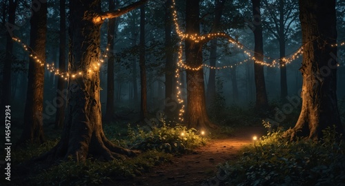 Fototapeta premium Enchanted forest path illuminated with glowing string lights, creating a...