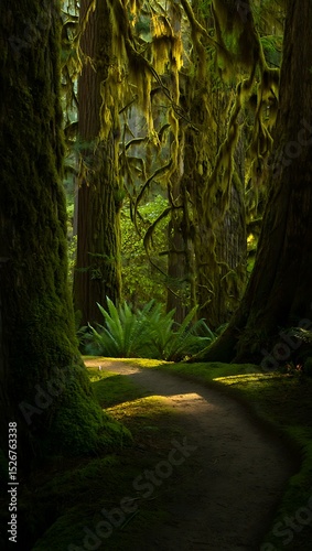 Obraz premium Enchanted Forest Path Moss-Draped Trees and Sunlit Trail