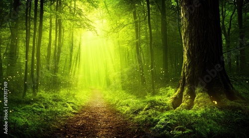 Obraz premium Enchanted forest path, sunlight filtering through trees