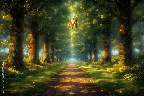 Naklejka premium Enchanted Forest Path: Sunlit Canopy and Mystical 'M'