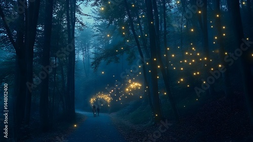 Fototapeta premium Enchanted Forest Path: The silhouette of two figures embark on an ethereal journey along a path through a mystical forest, illuminated by the enchanting glow of fireflies.