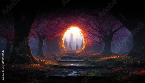 Naklejka premium Enchanted forest path to light