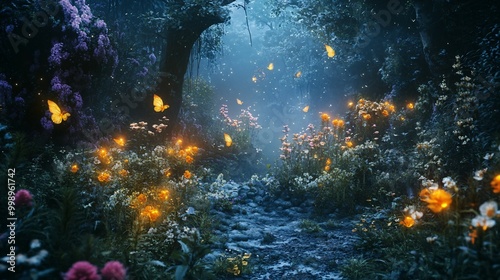 Fototapeta premium Enchanted Forest Path with Glowing Butterflies and Flowers