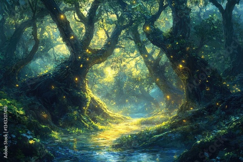 © Vibu design gallery, Obraz premium Enchanted forest path with glowing fireflies, a mystical stream flows through ancient trees.