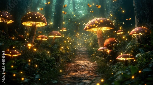 Naklejka premium Enchanted Forest Path with Glowing Mushrooms