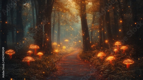 © Aku, Naklejka premium Enchanted Forest Path with Glowing Mushrooms and Fireflies Ambiance