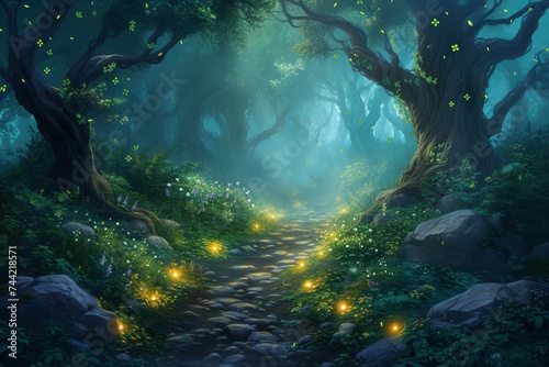 Fototapeta premium Enchanted forest pathway glowing fireflies twilight fantasy world mystical...