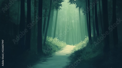 © euthan, Fototapeta premium Enchanted Forest Pathway Surrounded by Tall Trees and Fog