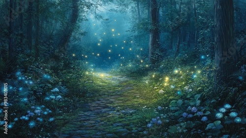 © Damerfie, Obraz premium Enchanted Forest Pathway with Glowing Fireflies