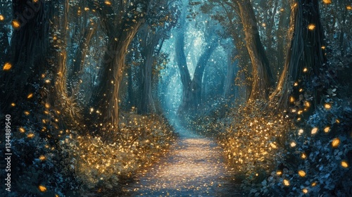 © Timeless Touch, Fototapeta premium Enchanted Forest Pathway with Glowing Lights and Lush Greenery in a Mystical Setting