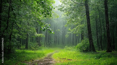 Obraz premium Enchanted Forest Rain: A Serene Path Through Lush Green Woods