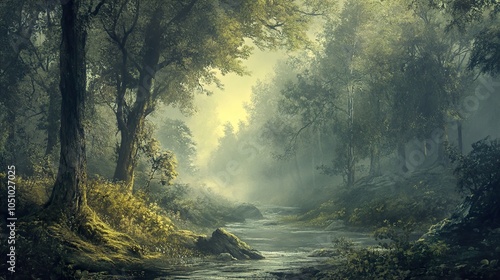 © Infinity, Obraz premium Enchanted Forest River: A Tranquil Landscape