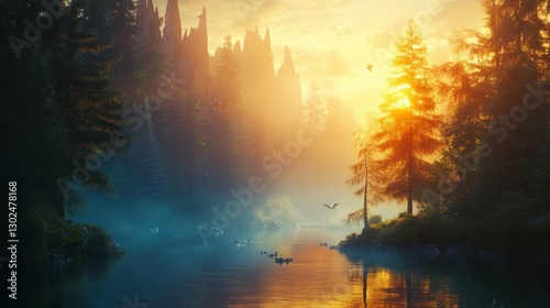 © Mulyadi Lim, Obraz premium Enchanted Forest River Sunset: A Serene Landscape