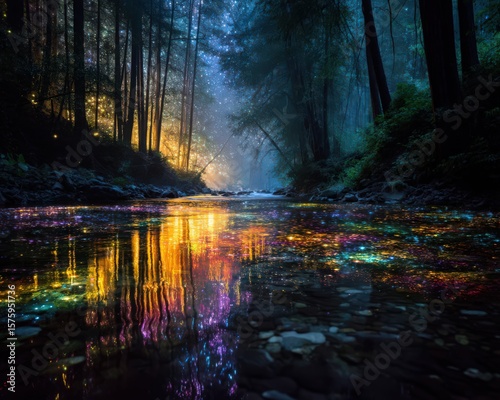 © Muhammad, Fototapeta premium Enchanted Forest River with Colorful Glowing Lights at Night