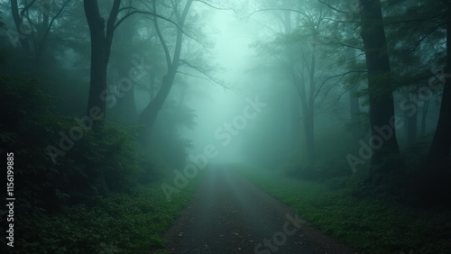 Obraz premium Enchanted Forest Road: Mystical Foggy Path