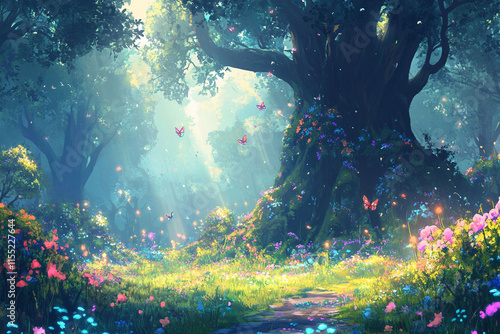 © Jyc art, Naklejka premium Enchanted forest scene with a glowing tree, dancing lights, and vibrant flowers. Perfect for fantasy, nature, and magical themes