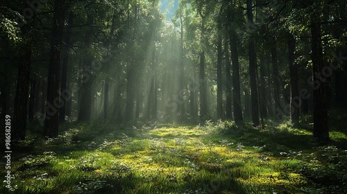 © Jakkarin, Fototapeta premium Enchanted Forest: Shadows and Light in a Tranquil Dark Paradise