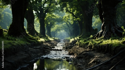 Fototapeta premium Enchanted Forest Stream: A Serene Path Through Lush Green Woods