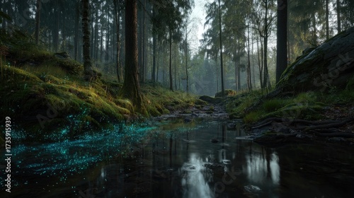 © Alam, Obraz premium Enchanted Forest Stream With Glowing Light