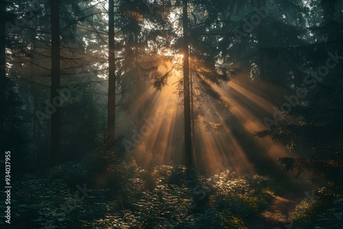 Naklejka premium Enchanted Forest: Sunlight Streaming Through Trees in a Misty Woodland