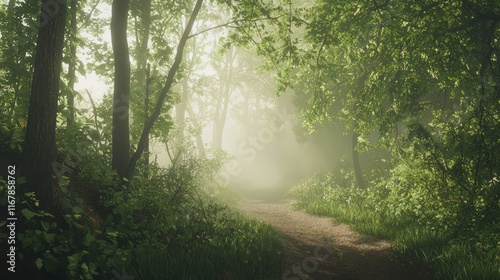 © Jakkarin, Fototapeta premium Enchanted Forest Trail: Mystical Foggy Path with Sunlight Filtering Through Trees, Illuminating Leaves and Underbrush in Tranquil Setting