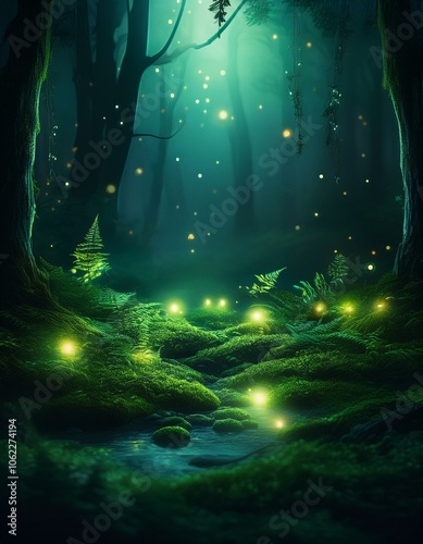 Fototapeta premium Enchanted forest with fireflies glowing in the night.