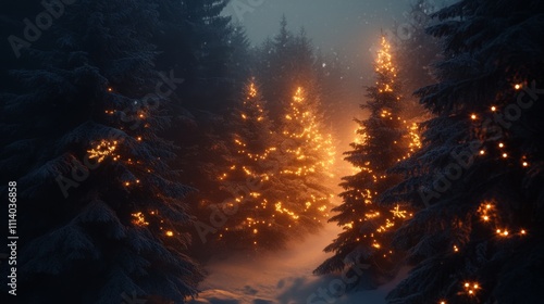 © Plaifah, Fototapeta premium Enchanted Forest with Glowing Christmas Trees in Foggy Night
