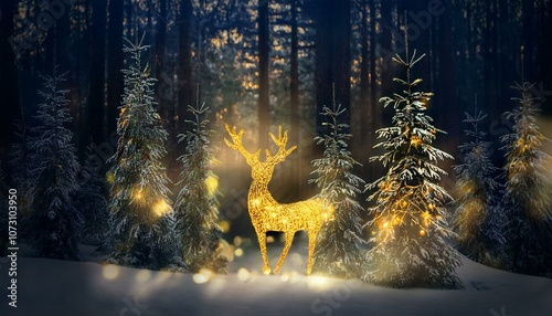 Fototapeta premium Enchanted forest with golden light reindeer and illuminated trees