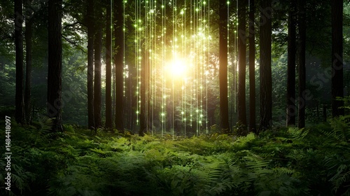 © Supatinee, Obraz premium Enchanted Forest with Shimmering Light Rays and Lush Greenery in a Serene Environment