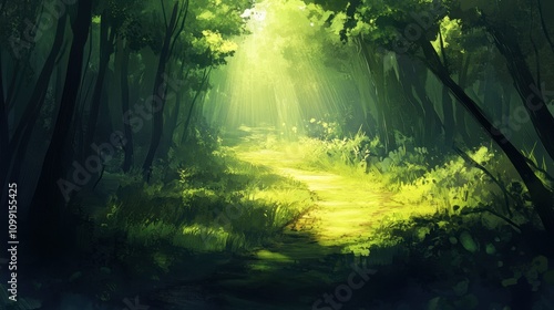 Obraz premium Enchanted Forest with Sunlight and Greenery