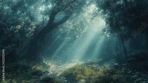 Fototapeta premium Enchanted Forest with Sunlight and Misty Atmosphere