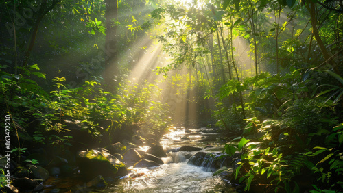 © Kara, Obraz premium Enchanted Forest with Sunlight Filtering Through Trees