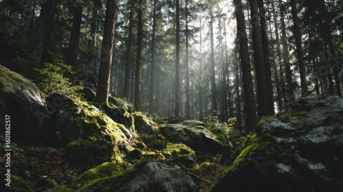 Obraz premium Enchanted Forest with Sunlight Streaming Through Trees and Lush Green Moss-covered Rocks in a Serene Natural Setting