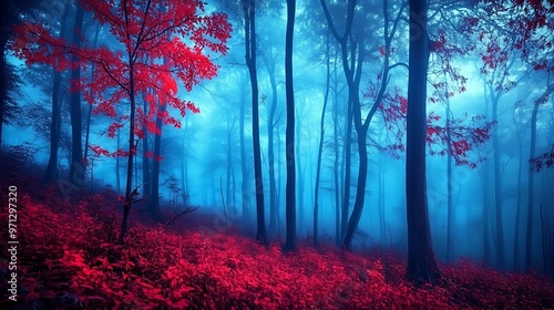 © aironamad, Obraz premium Enchanted Forest with Vibrant Red Leaves Surrounded by Mysterious Blue Fog