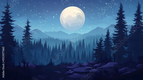 Naklejka premium Enchanted Full Moon Illuminating Mysterious Spruce Trees at Night