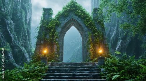 Obraz premium Enchanted Gateway: A moss-covered stone archway, bathed in the ethereal glow of flickering lanterns, stands sentinel in a misty, verdant forest.