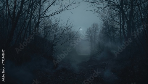 © vxnaghiyev, Obraz premium Enchanted gloomy woodland shrouded in dense mist
