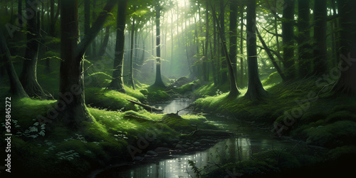 Fototapeta premium Enchanted Green Mystic Forest, Generative AI