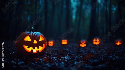 © Arthur Constantine, Fototapeta premium Enchanted Halloween Forest with Glowing Jack-o'-Lanterns - Spooky Holiday Background in Dark Woods with Copy Space, Selective Focus | Ultra HD