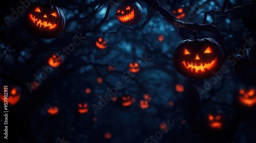 Fototapeta premium Enchanted Halloween Forest with Jack o'Lanterns on Trees Illuminating the...