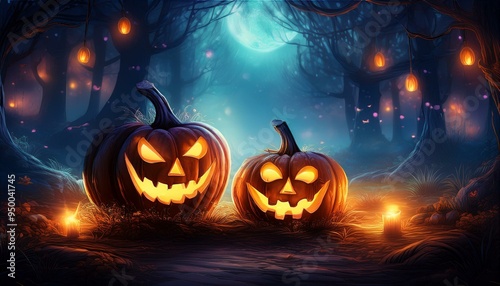 Fototapeta premium Enchanted Halloween Night Two glowing jack-o'-lanterns with mischievous grins...