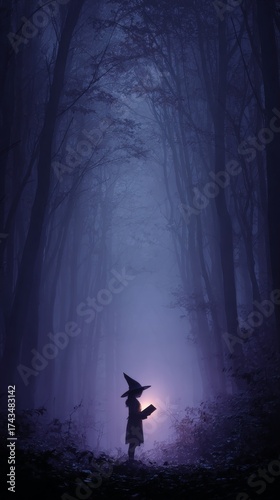 © R, Fototapeta premium Enchanted journeys: a witch's tale in the mystical forest. Adventure poster. Magical encounter: a young witch and her luminescent spell book. Scifi poster. Visual poster.