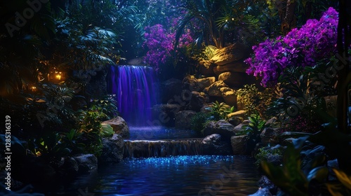 © jirasin, Obraz premium Enchanted Jungle Waterfall with Lush Foliage and Colorful Flowers
