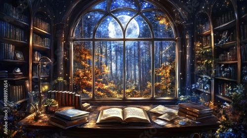 © GASTAN ALVARENDRA ST, Obraz premium Enchanted library's window view to a starry night forest.