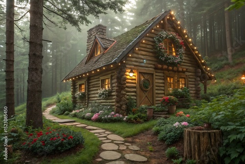 Fototapeta premium Enchanted log cabin in misty forest with stone path