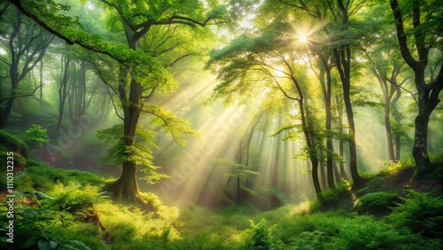 Obraz premium Enchanted Misty Forest: Ethereal Light Filtering Through Lush Green Canopy,...